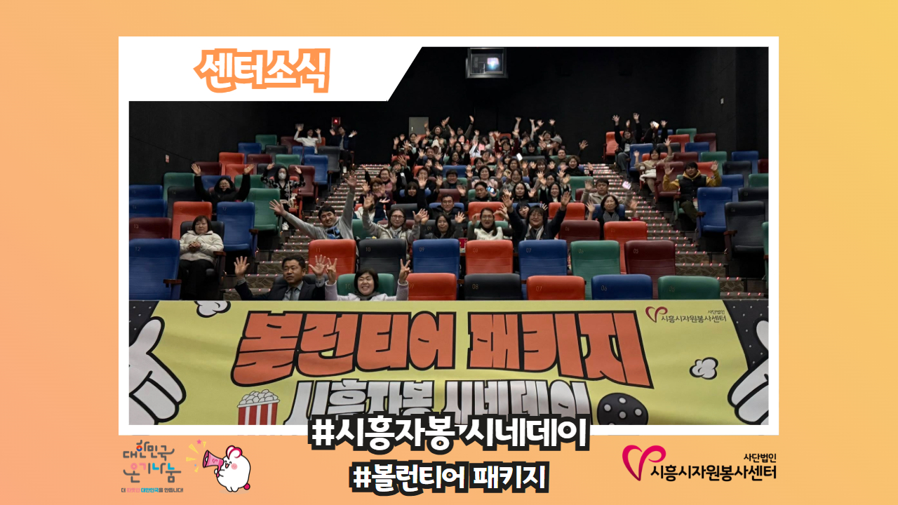 [센터소식-볼런티어 패키지 '시흥자봉 시네데이'] 🎬 볼런티어 패키지 '시흥자봉 시네데이' 12월 6일(토) 활동인증 제도에 참여한 신규 봉사자부터 지역사회에 공헌도가 높은 우수 자원봉사자 약 180여 명을 초청했습니다! 메가박스 영화관에서 시흥시 자원봉사자들과 함께 특별한 하루 ‘시흥자봉 시네데이’가 진행이 되었습니다!🥳 ..