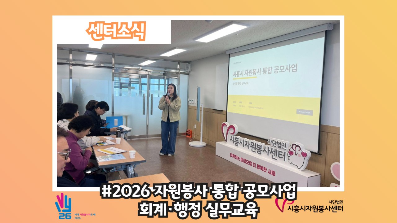[센터소식-#2026 자원봉사 통합 공모사업 회계·행정 실무교육 진행] 2026년 자원봉사 통합 공모사업 선정 단체를 대상으로 자원봉사센터 교육실에서 회계·행정 실무교육을 진행했습니다👍🏻 심사위원들의 깊은 고민 끝에 선정된 25개 단체와 동 자원봉사지원단의 대표자 및 실무자분들께서 함께해 주셨습니다‼️ 이번 교육에서는 ✔️ 회계처리 기준 및 방법 ✔️ 회계서류 ..