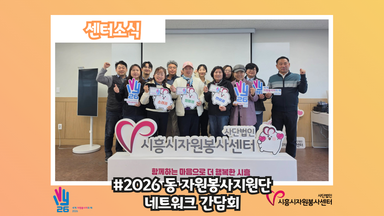 [센터소식-#2026년 동 자원봉사지원단 네트워크 간담회] 3월 25일(수), 동 자원봉사지원단 네트워크 간담회가 진행되었습니다. 🤝 이번 간담회에서는 시흥시자원봉사센터에서 운영 예정인 다양한 프로그램과 교육을 안내하며, 앞으로의 활동 방향을 함께 공유하는 시간을 가졌습니다. 📚 특히 연성권·정왕권·소래권으로 나뉘어 권역별로 ‘찾아가는 동 자원봉사센터’와 관련..
