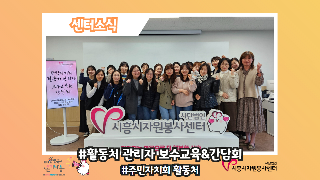 [센터소식-#주민자치회 활동처 관리자 보수교육 및 간담회] 10월 29일, 시흥시 20개 동 주민자치회 활동처 관리자를 대상으로 보수교육과 간담회가 진행되었습니다 😀 '자원봉사 활동처'란 지역사회에서 자원봉사자와 함께 공익사업을 수행하고자 하는 비영리기관, 공공기관, 사회복지시설 등을 의미하며, 현재 시흥시에는 412곳의 활동처가 등록 되어있습니다 👏👏 주민자치회 활동처의 자원봉사 운영 역량과 ..
