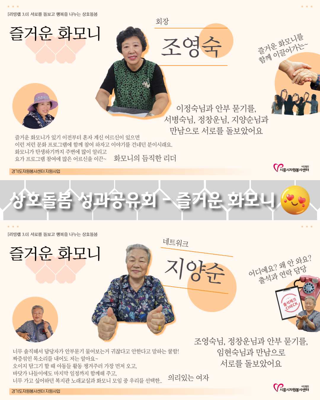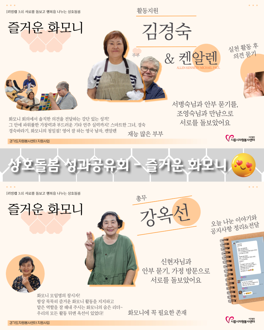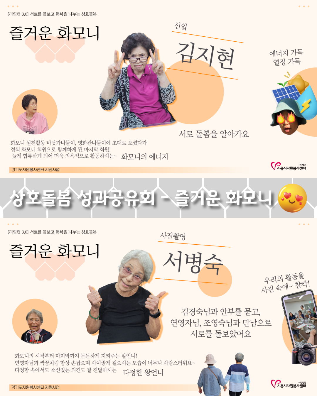 #경기도 #시흥시 #시흥시자원봉사센터 #경기도자원봉사센터 #자원봉사협동조합모아 #아우룸사회적협동조합 #지원사업 #자원봉사 #온기나눔 #노인 #상호돌봄 #노노케어 #노인상호돌봄 #리빙랩 #생활실험실 #즐거운화모니 #성과공유회 #감동의도가니