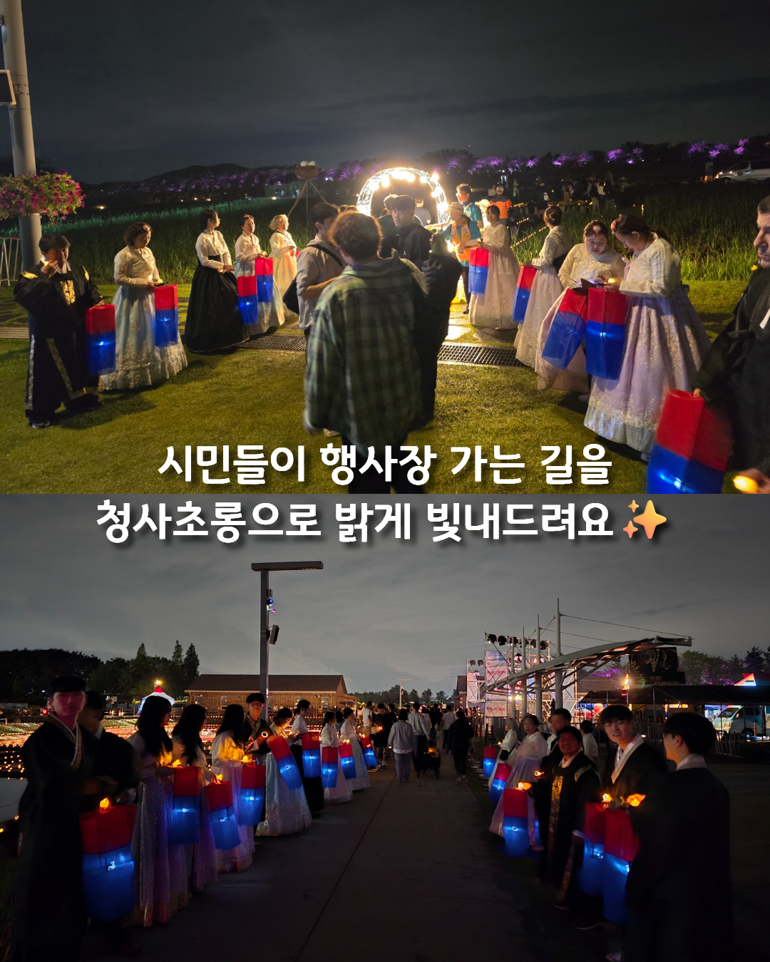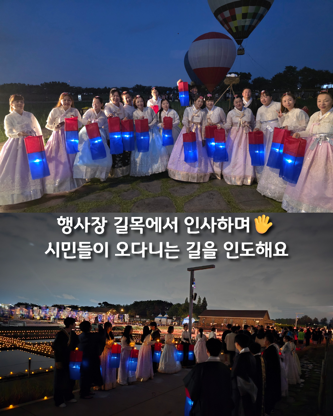 27일, 28일 갯골생태공원에서 야간에 진행 된 발레 공연이 있었는데요! 공원 안쪽으로 공연을 보러가는 길목에 어두운 산책로마다 우아한 한복의 자태를 뽐내며~ 작지만 밝은 청사초롱을 들고 계신 #다문화 단체 자원봉사자 및 #청년 자원봉사자분들이 시민들이 길을 잘 안내받을 수 있도록 해주셨습니다🖐️