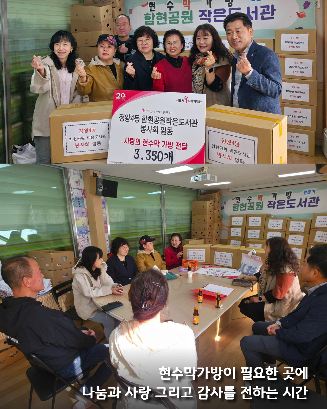 10월 29일 정왕4동행정복지센터 내에 있는 함현공원작은도서관에서 행정복지센터, 병원, 자원봉사단체 등에 자원봉사자의 사랑과 노력이 듬뿍담긴 현수막 가방 3,350개를 전달하는 시간을 가졌습니다🩵🛍️