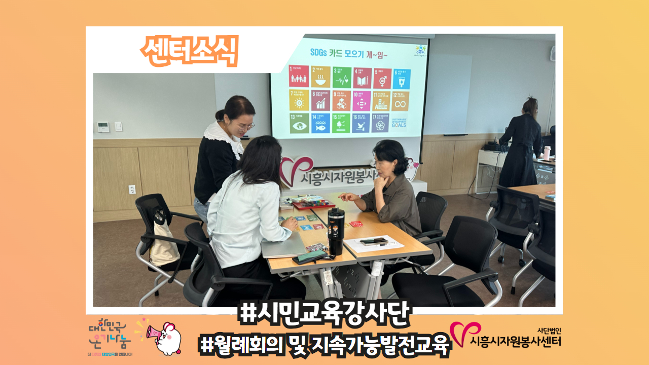 [센터소식-#시민교육강사단 9월 월례회의 및 교육] 🌱 시민교육강사단 9월 월례회의 & 지속가능발전교육 🌱 9월 25일(목), 시흥시자원봉사센터 4층에서 시민교육강사단이 9월 월례회의와 함께 지속가능발전교육을 진행했습니다. 먼저 월례회의를 통해 지난 활동을 점검하고 앞으로의 방향을 함께 고민한 뒤, 이어진 교육 시간에는 시흥시지속가능발전협의회에서 연계해 주신 강사님과 함께 SDGs를 배워보는 시간을 가졌습니다. 특히 교육이 시작되기 전, 협의회 국장님의 따뜻한 인사말씀으로 자리가 더욱 의미 있게 열렸습니다. 👉 SDGs 카드 모으기 게임으로 즐겁게 배우고, 👉 조별 토론을 통해 우리 지역에 필요한 목표..