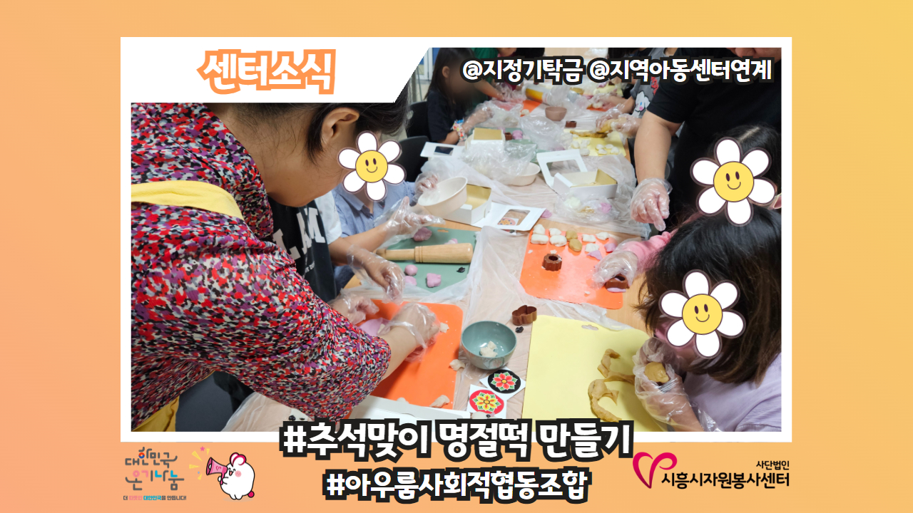 [센터소식-#아우룸사회적협동조합, #지정기탁금사업 #추석맞이 #전통떡 만들기] #시흥시 #봉사활동 현장💕 9월 24일 #아우룸사회적협동조합 봉사자들과 함께 추석맞이 전통떡 만들기 활동을 진행했습니다!🍡 고사리 손으로 조물조물~ 만들다가도 한입 먹어보고~😋 아우룸사회적협동조합 봉사자들의 따뜻한 마음이 고스란히 담겨 아이들과 웃음꽃을 피웠습니다🌸 #버슘행복나눔 #노다지복권방 덕분에 지역아동센터 아동들과 풍성한 명절의 의미를 더할 수 있었습니다.😊 앞으로도 이어질 추석맞이 풍성한 행복나눔 이야기 전해드리겠습니다. #시흥시자원봉사센터 #온기나눔 #나눔실천 #추석맞이 #전..