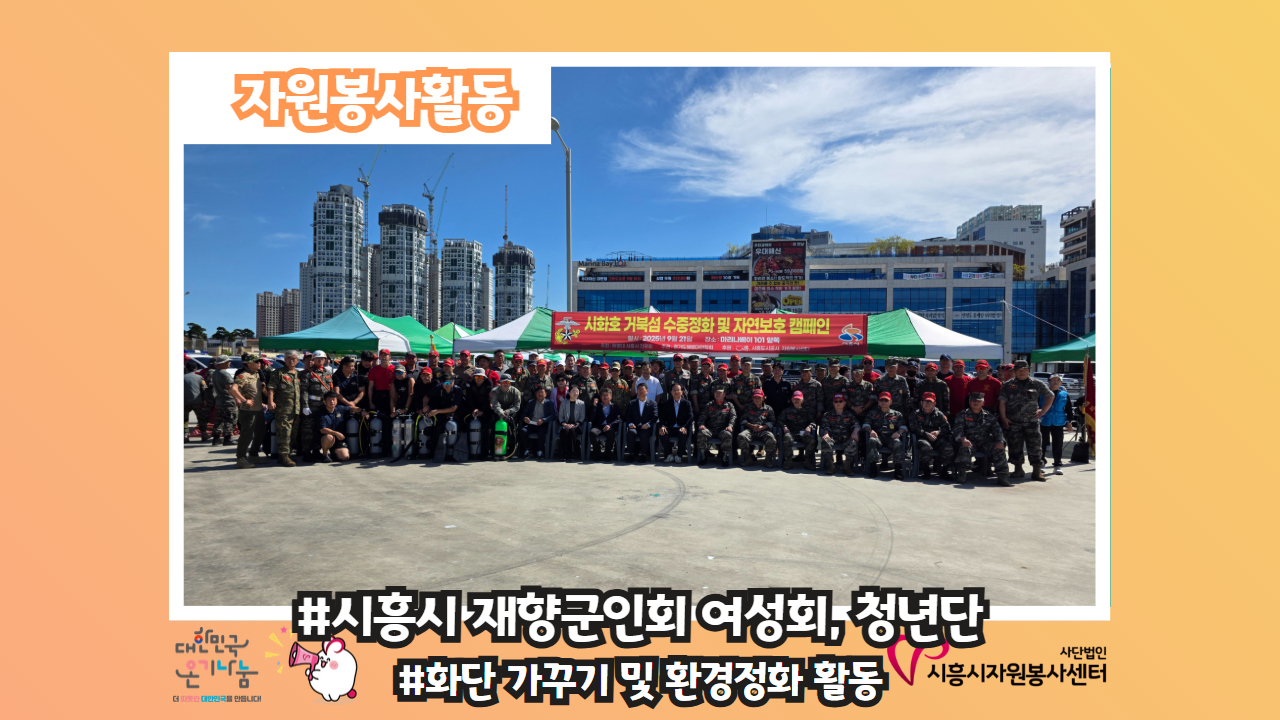 [자원봉사활동-#해병대시흥시전우회 수중 정화 및 수변 청소 활동 현장 스케치] 파란 하늘이 유독 바다같았던 9월 21일 오전, 거북섬동의 푸른 바다🌊를 뒤로하고 해병대시흥시전우회에서 수중 정화 및 수변 청소 활동을 위해 경기 권역의 해병전우회와 시흥도시공사 직원들과 함께 힘을 모았습니다💪 수중 정화 활동을 통해 시화호의 아름다운 바다를 지키고, 수변 환경을 개선하는 의미있는 활동으로 매년 해병대시흥시전우회에서 주관해서 진행하고계십니다!🫡 해병대원들과 시흥도시공사에서 거북섬동을 걸으며 시민들의 깨끗한 거리 이용을 위해 환경정화에 참여해주셨어요💫 이에 저희 센터에서 활동에 도움이 되시길 바라며 스포츠 손타올 300개도 지원해드렸습니다💫..