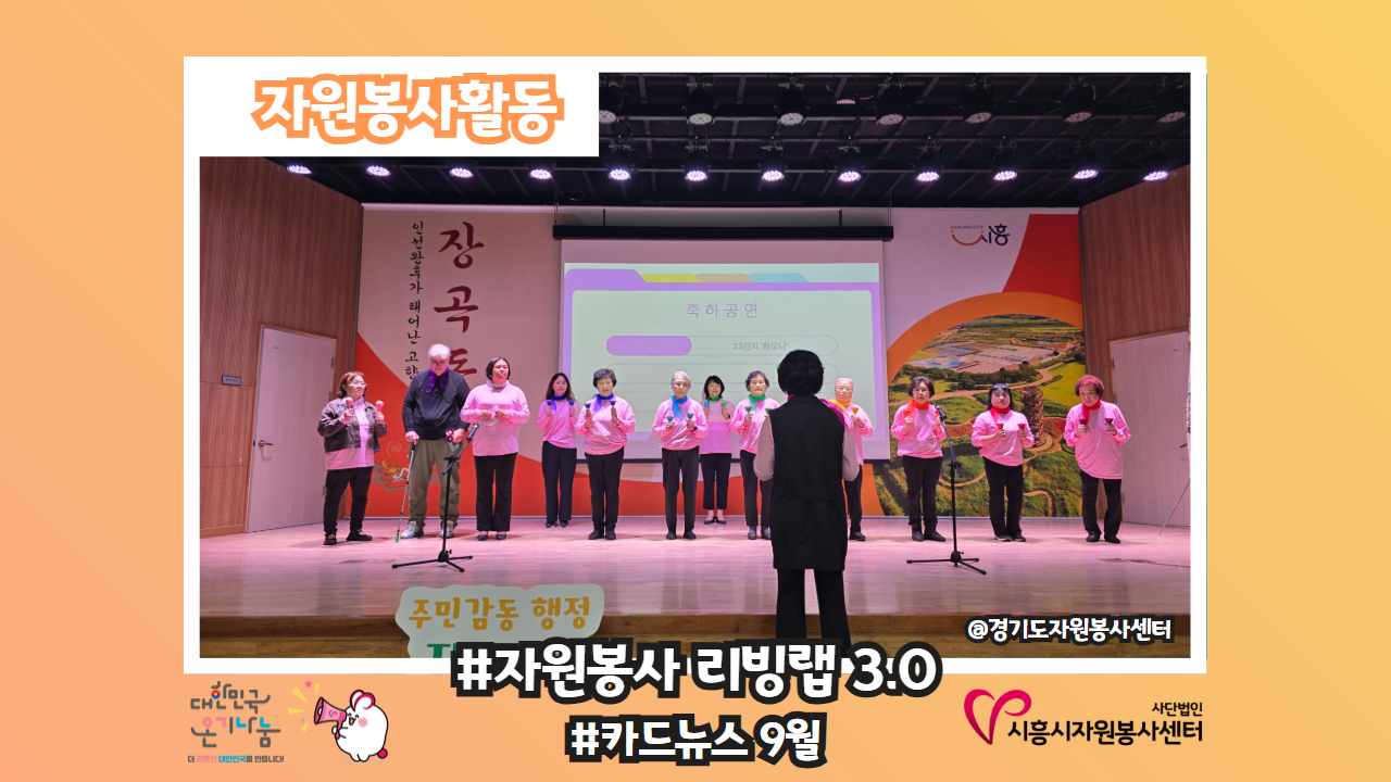[센터소식-자원봉사 리빙랩 3.0 카드뉴스] 서로를 돕고 행복을 나누는 생활 실험실🔬🔭🔍 시흥시 노인 상호 돌봄 자원봉사 리빙랩👩🦳🧑🦳 9월 이야기 전해드려요📣 9월부터는 모임 활동 시간을 변경했어요 즐거운 화모니 어르신들과 함께 아우룸사회적협동조합 조합원분들이 자원봉사로 참여해 주시기로 하면서👍 일정과 시간을 늘려 본격적인 준비에 들어갔답니다! 🎤🪇🎸🎹🎼 연습 기간 총 10회.. 드디어 대망의 공연 날~ 경기도자원봉사센터 리빙랩 영상촬영 센터로 선정되어 8월에 이어 9월 활동에 2차 촬영을 와 주셨어요~ 분홍 티셔츠 맞춰 입고 핸드벨 색상에 맞춰..