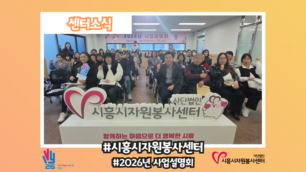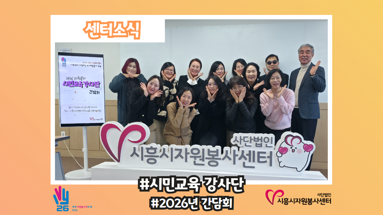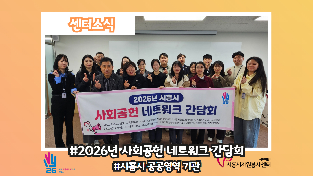 [센터소식-#시흥시 공공영역 기관과 함께하는 2026 사회공헌 네트워크 간담회] 한 마음 한 뜻으로 시흥시에 따뜻한 온기를 전하는 사회공헌 활성화를 위해 우리가 처음 이 자리에 모였다‼️‼️ 바로 시흥시 공공기관, 관내 대학교 및 종합병원 등 각 기관의 사회공헌 담당자분들입니다🥰 처음이라 떨림과 설레임 그리고 의욕 한 가득💪 품고 센터 사업계획을 시작으로 각 기관별..