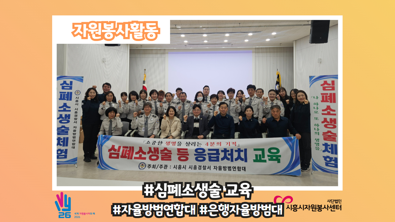 [자원봉사활동-#심폐소생술 교육 #자율방범연합대, 은행자율방범대] 🚨 시민의 안전을 위한 든든한 준비 2월 25일 🌙19:30 시흥시 시흥경찰서 자율방범연합대의 심폐소생술(CPR) 및 응급처치 교육이 지난 해에 이어 올해도 진행되었습니다! 이번 교육은 은행자율방범대를 시작으로~~ 시흥시 20개 동 자율방범대원들을 대상으로 순차적으로 이어질 예정입니다!😃 ..