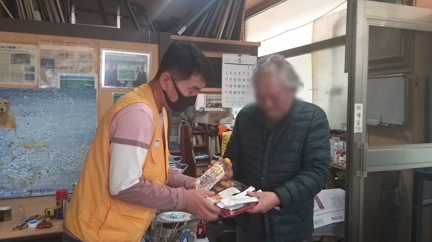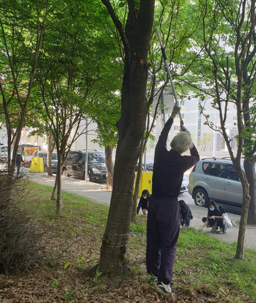 장곡동 방치된 공원에 긴 자루가 달린 톱을 가지고 나타난 봉사자