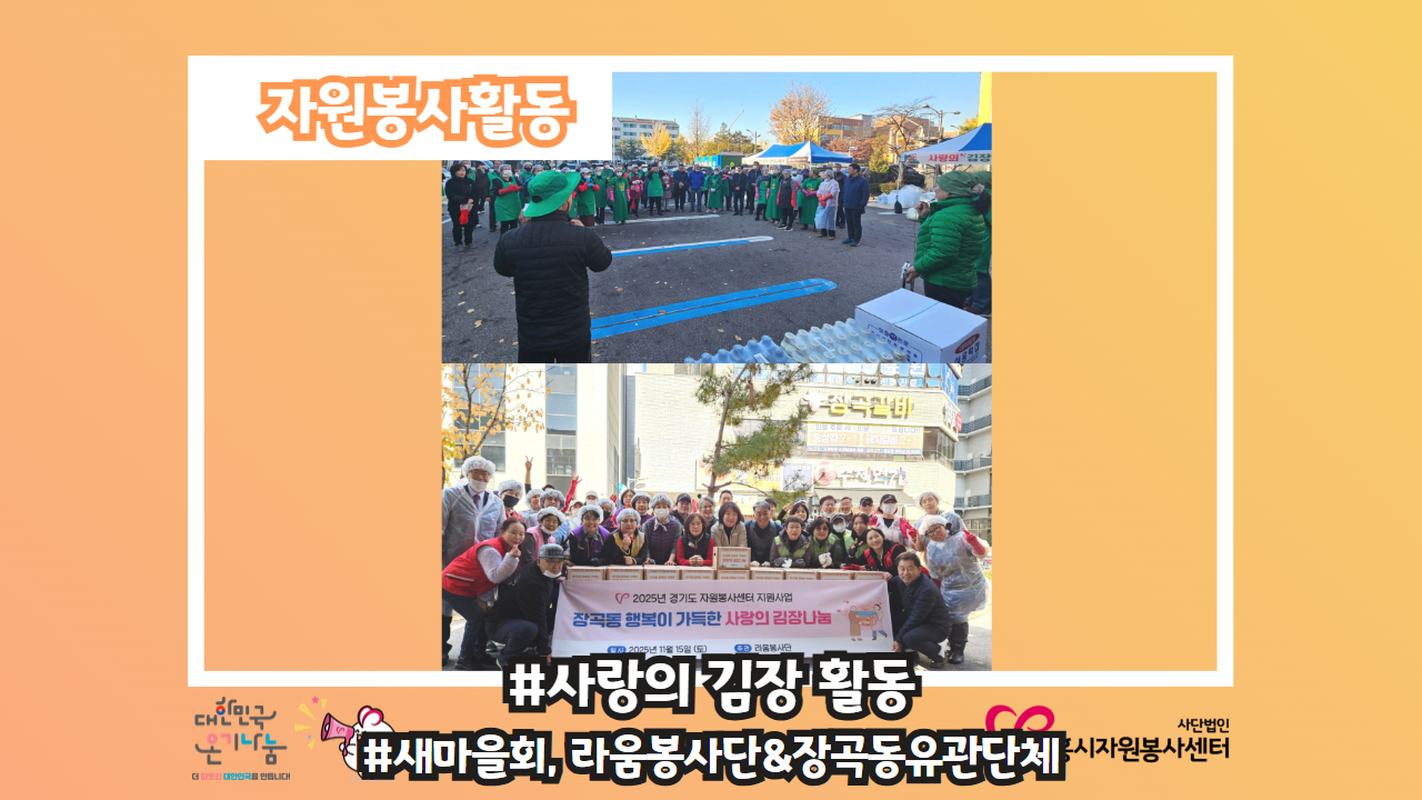 [자원봉사활동-시흥시 김장 나눔 활동] 차가운 바람이 찾아온 11월, 경기도자원봉사센터 2025년 취약계층 지원사업을 통해 시흥시자원봉사센터와 지역의 여러 자원봉사단체가 함께 김장 나눔 활동을 진행했습니다💛 싱싱한 배추를 손질하는 손길, 양념을 정성껏 버무리는 손길, 직접 버무린 김치를 박스에 담아내는 손길 속에는 올 겨울 이웃들이 조금이라도 따뜻하게 지내시길 바라는 마음이 담겨 있었습니다🖐️ 행사장..