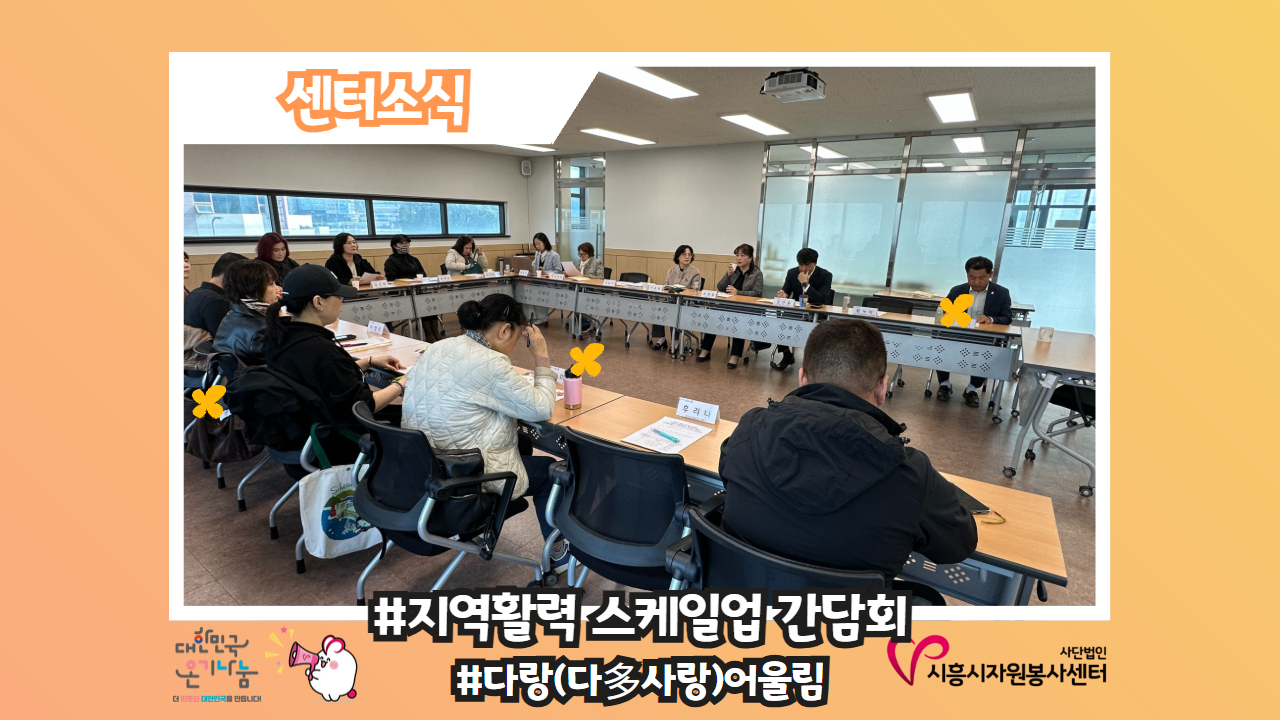 [센터소식-시흥시 지역활력 스케일업 프로젝트 '다랑(다多사랑)어울림' 네트워크 간담회] 🌿 2025년 시흥시 지역활력 프로젝트 「다랑(다多사랑)어울림」 네트워크 간담회 🌿 10월 30일(목), 시흥시자원봉사센터 성장에서 ‘다랑(다多사랑)어울림’ 네트워크 간담회가 진행되었습니다!👏 이번 간담회는 한 해 동안 진행된 「다랑(다多사랑)어울림」 사업의 추진성과를 ..