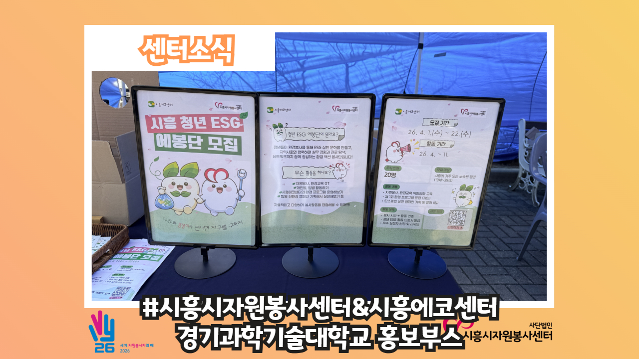 [센터소식-#시흥에코센터 & #시흥시자원봉사센터 홍보부스] 따사로운 햇빛이 #경기과학기술대학교 에 내려오는 어느 날!🌞 시흥에코센터와 시흥시자원봉사센터에서 현재 모집중인 시흥 청년 ESG '#에봉단' 홍보 내용과 함께 부스 운영했는데요~!🤗 ☝1일차 시흥시자원봉사센터에서는 '#언제나자원봉사' 탄소저감 실천 활동과 함께 활동인증 프로그램을 소개하는 시간도 가졌습니다! 그리고 퀴즈퀴즈~ 자원봉사 퀴즈~! 그리고 탄소중립 퀴즈! 재미있는 참여 시간으로 홍보부스를 채웠어요✔ ✌2일차 시흥에코센터에서는 ..