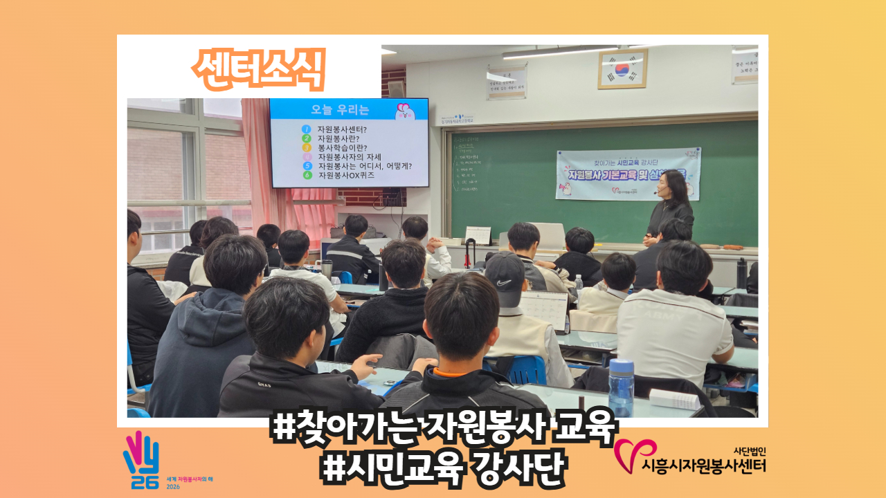 [센터소식-단체맞춤교육 #자율방범연합대] 💝2026 세계 자원봉사자의 해💝 ++ 전문교육 첫 번째📚 지난 3월 5일 저녁, 시흥시 시흥경찰서 자율방범연합대와 함께 🚨 시민 안전을 지키는 리더들을 위한 맞춤형 교육을 진행했습니다! 이번 교육은📖 '함께 지키는 마음, 함께 지켜야 할 관계'를 주제로 자원봉사 조직에서 리더가 갖추어야 할 ❣️ 역할과 책임 ❣️ 의사소통 유형 이해 ❣️ 갈등 관리와 공감·경청 기술 등 현장에서 필요한 핵심 역..