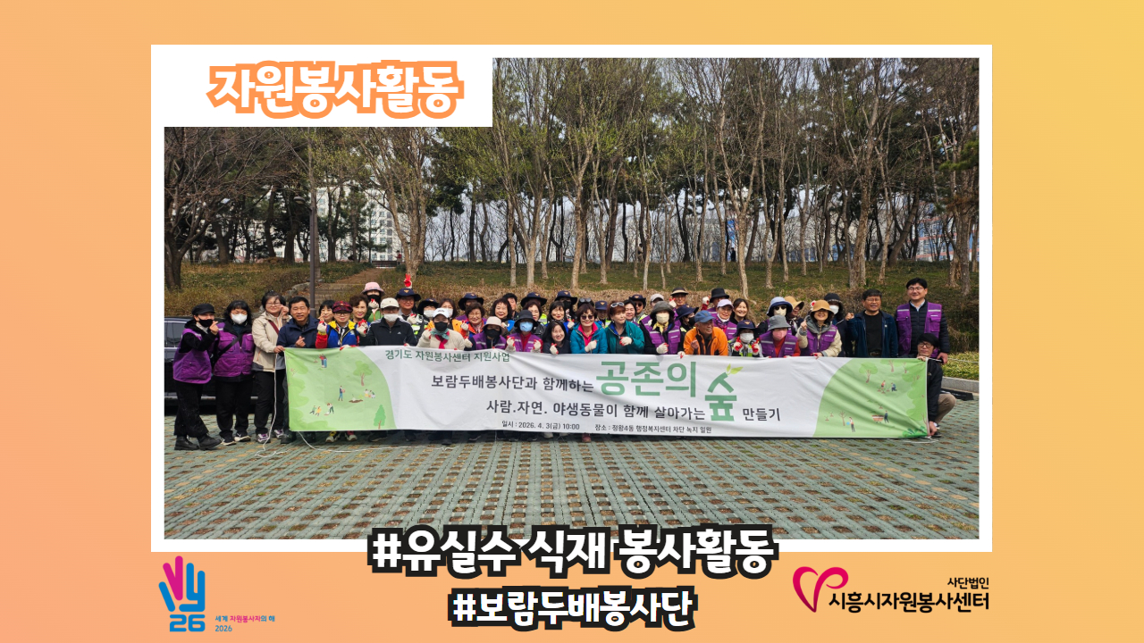 [자원봉사활동-#보람두배봉사단 유실수 식재 봉사활동] 사람·동물·자연이 함께 숨 쉬는 정왕4동, ‘공존의 숲’ ! 🌳 지난 4월 3일, 보람두배봉사단은 경기도자원봉사센터 지원 사업의 일환으로 뜻깊은 유실수 식재 봉사활동을 진행했습니다. 단순히 나무를 심는 것에 그치지 않고, 생태계를 어지럽히는 교란식물을 관리하며 야생동물들의 소중한 먹이원이 될 유실수들을 정성껏 심었습니다. 이번 활동을 통해 우리 곁의 차단녹지가 사람과 동물이 함께 어우러지는 ..