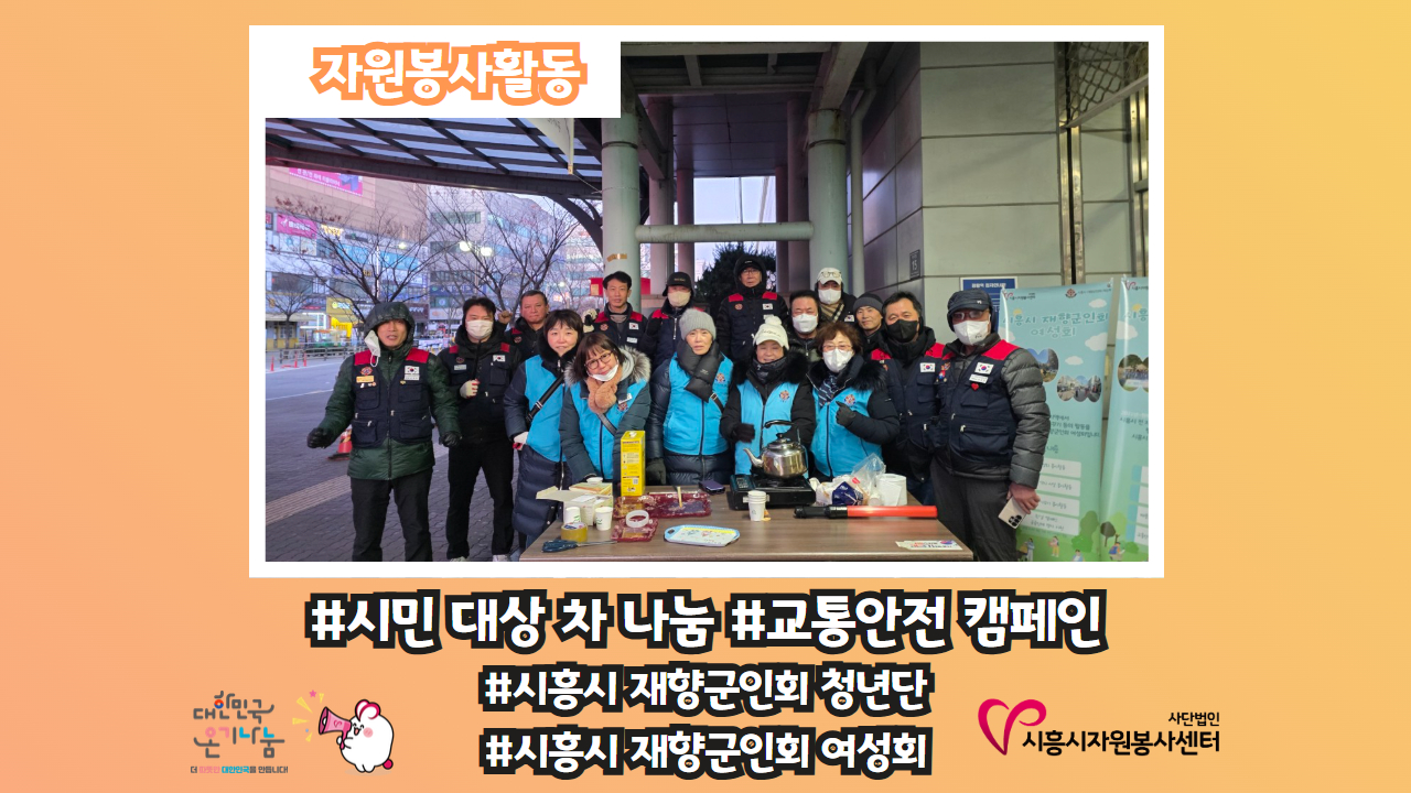 [자원봉사활동-#시흥시 재향군인회 청년단, #시흥시 재향군인회 여성회 #시민 대상 차 나눔, 교통안전 캠페인] 26년 1월 1일 새해 첫날, 시흥시 재향군인회 청년단과 시흥시 재향군인회 여성회가 정왕역에서 시민들과 함께 새해의 첫 인사를 나눴습니다 🤗 시민들께 따뜻한 차 한 잔을 건네며 "새해 복 많이 받으세요🥰"라는 인사를 전하고, ..