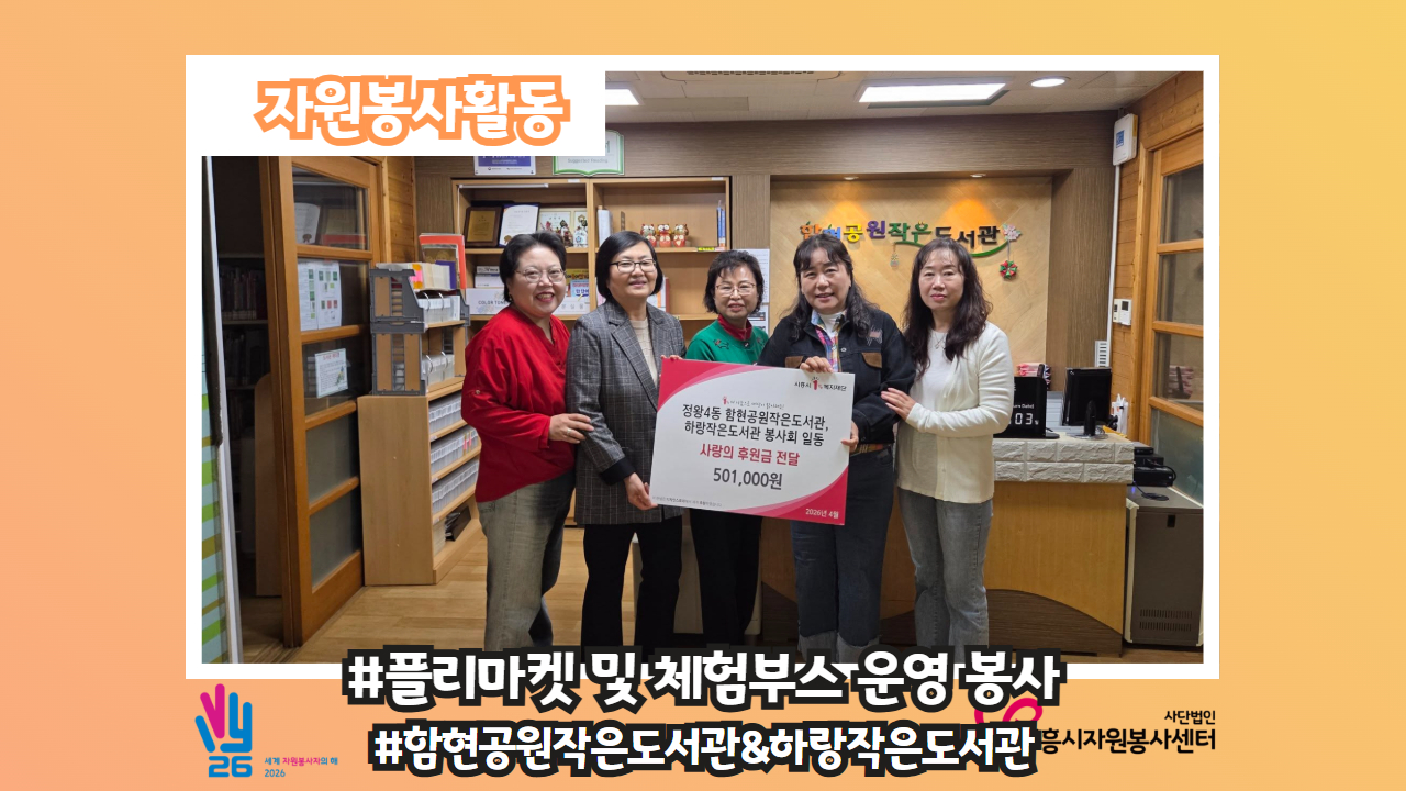 [자원봉사활동-#플리마켓 및 체험부스 운영 봉사] 정왕4동의 사랑방, 함현공원작은도서관과 하랑작은도서관의 연합활동이야기인데요~🙌 따스한 봄볕이 내리쬐던 지난 4월 11일, 우리 이웃들과 함께한 소중한 축제 소식을 전해드려요. 함께 나누고, 함께 웃었던 우리들의 기록💕😽 🎀온정이 모인 프리마켓🎀 봉사자분들과 주민분들 여러곳에서 나눔해 주신 소중한 물건들이 새 주인을 만났습니다. 이 귀한 수익금은 우리 아이들을 위한 장학금으로 기부되어 더 큰 사랑으로 피어날 거예요. 🎀가족과 함께한 행복한 다양한 체험🎀 고사리 같은 손으로 무언가를 만들고, ..