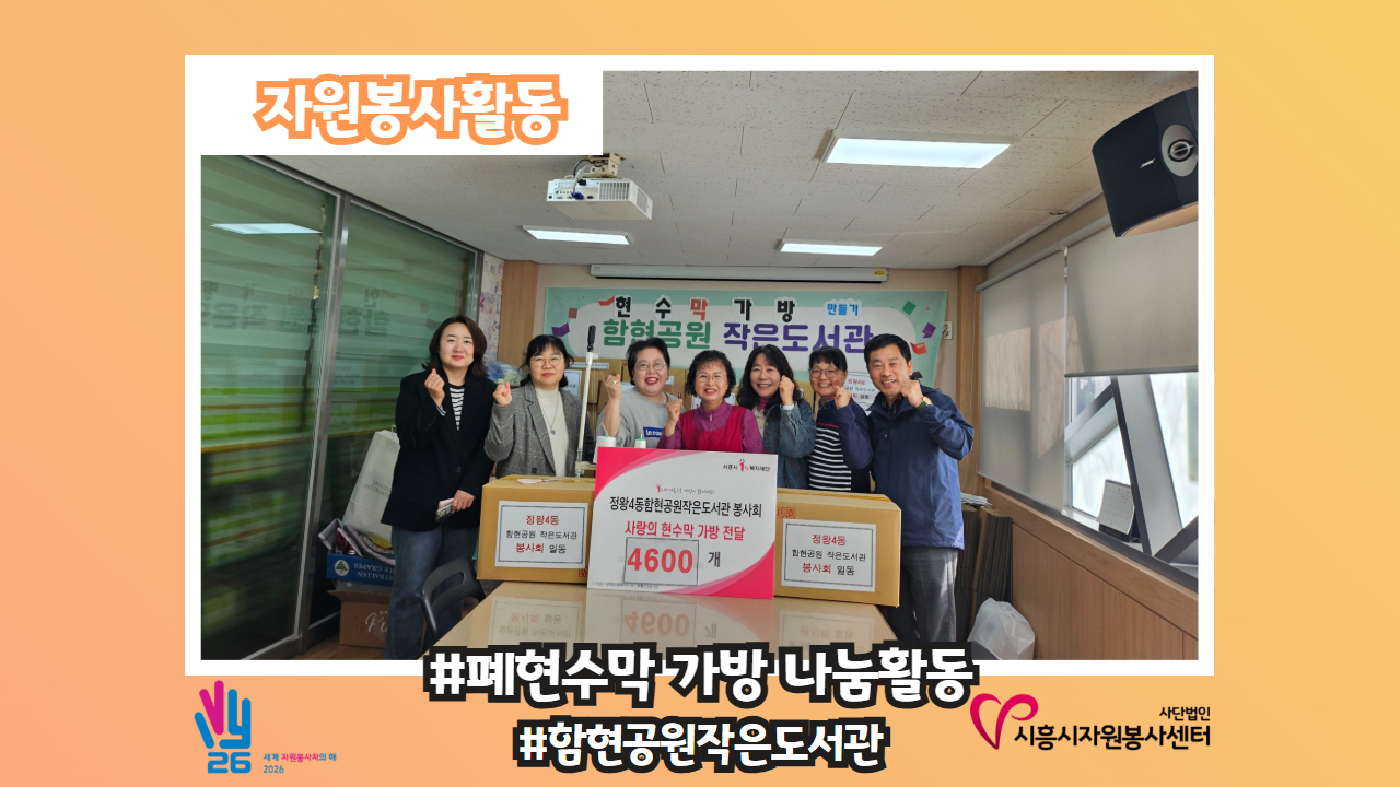 [자원봉사활동-#폐현수막 가방 나눔 활동] 폐현수막의 놀라운 변신! 지구를 살리는 '사랑의 현수막 가방' 나눔 🎒🌱 지난 4월 3일, 함현공원작은도서관 봉사단체는 환경 보호를 위한 특별한 나눔 행사를 진행했습니다. 버려지면 환경오염의 원인이 되는 폐현수막을 하나하나 정성껏 재가공하여, 실용적인 💕'사랑의 현수막 가방'💕으로 재탄생시켰습니다. 이번에 제작된 총 4,600개의 가방은 우리 지역의 각 동 행정복지센터와 유관 단체 등에 전달되어 소..